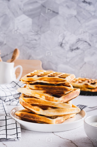 Стопка свежеиспеченных бельгийских вафель на тарелке и сметана в миске на столе, вертикальный вид