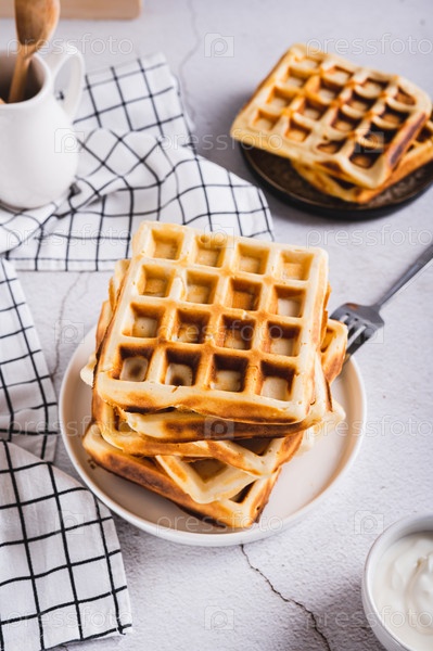 Вкусные домашние бельгийские вафли на тарелке на столе вертикальный вид