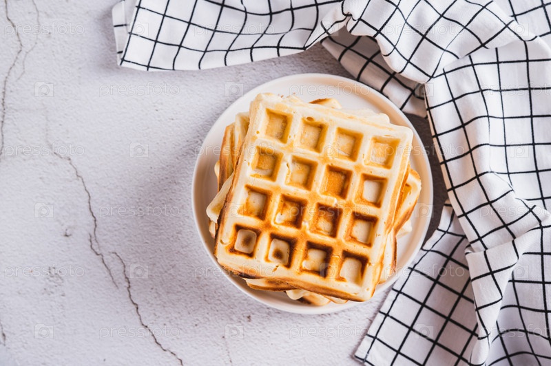 Крупный план стопки свежеиспеченных бельгийских вафель на тарелке на столешнице