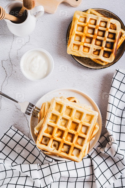 Вкусные домашние бельгийские вафли на тарелке на столешнице и вертикальный вид
