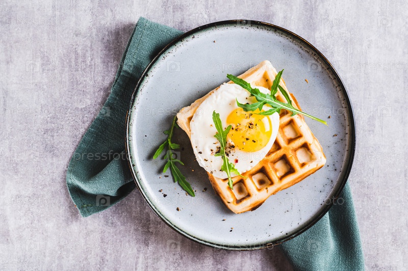 Крупный план бельгийских вафель с жареным яйцом, рукколой и специями на тарелке на столешнице