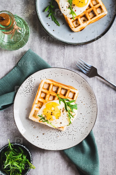 Домашние хрустящие вафли с яйцом и рукколой на тарелке на столешнице и вертикальный вид