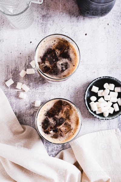 Модная пушистая кола с зефиром в стаканах на столешнице и вертикальный вид