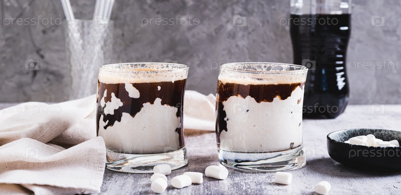 Напиток из колы и зефира в стаканах на веб-баннере стола