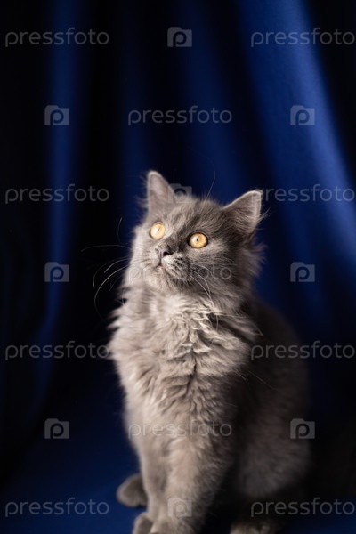 Пушистый серый кот сидит и смотрит вверх на синем фоне. Позирует. Концепция питомца