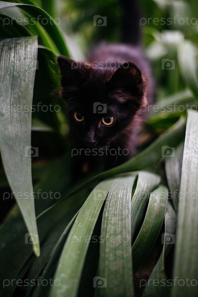Черный маленький любопытный кот охотится за кем-то в зеленой листве. Домашние животные