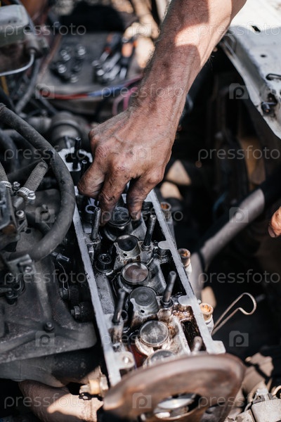 Рабочий ремонтирует головку блока цилиндров автомобильного двигателя. Клапан удаления масла. Ремонт автомобилей. Автосервис