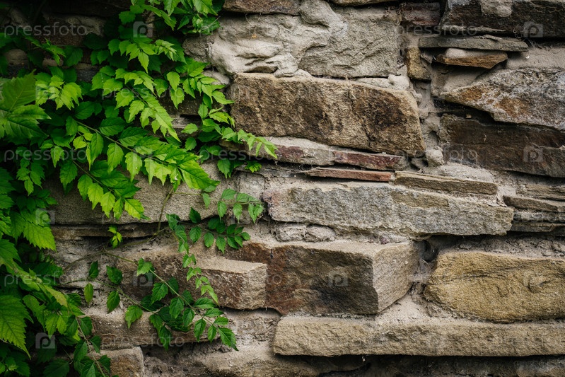 Каменная стена с зелеными растениями. Фоновое изображение. Копировать пространство