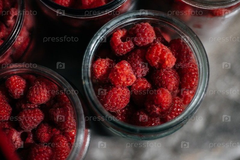 Малина в стеклянной банке. Вид сверху. Подготовка к приготовлению варенья или компота
