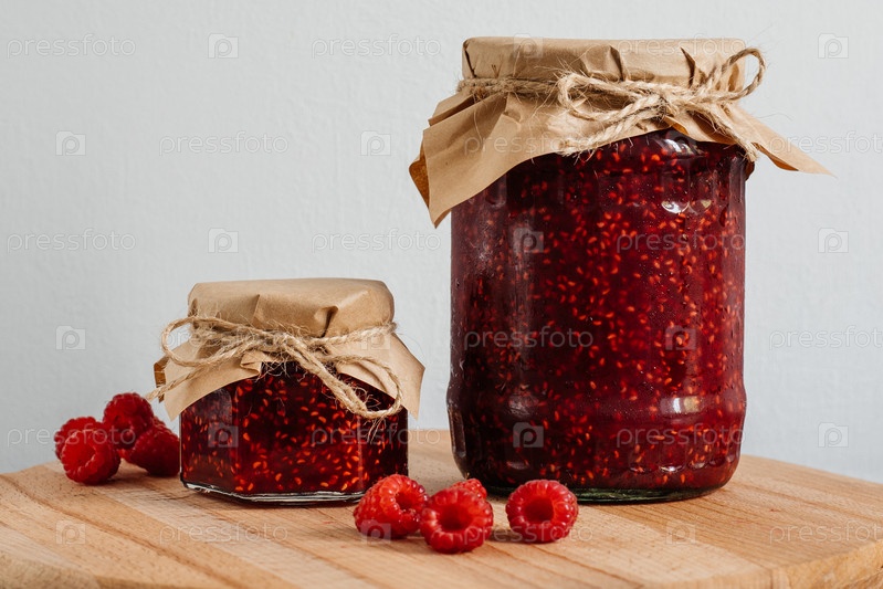 Малиновое варенье в большой и маленькой банке на деревянной доске, крышка украшена бумагой и перевязана шпагатом. Малина лежит рядом. Баннер, меню, рецепт место для текста