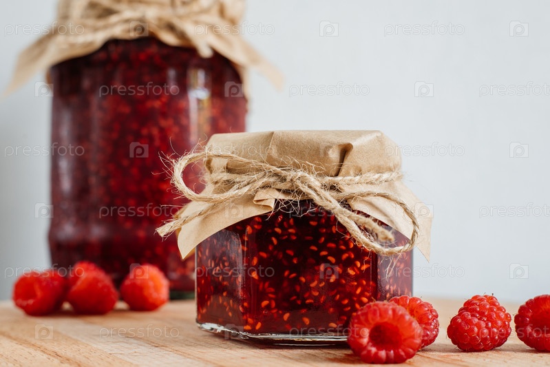 Малиновое варенье в большой и маленькой банке на деревянной доске, крышка украшена бумагой и перевязана шпагатом. Малина лежит рядом. Баннер, меню, рецепт место для текста