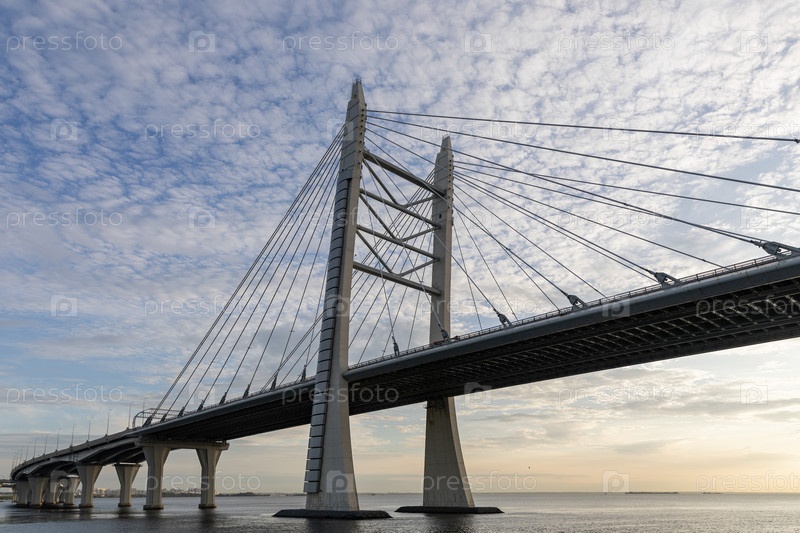 Россия. Санкт-Петербург. Мост через Корабельный фарватер автодорожный металлический ватовый мост, входящий в состав Западного скоростного диаметра. Россия. Санкт-Петербург. The bridge over the Ship's Fairway is a metal cablestayed road bridge, which