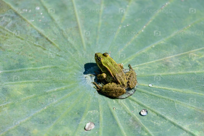 Россия. Астрахань. Лягушка сидит на листьях кубков. Россия. Астрахань. Жаба сидит на листьях водяных лилий