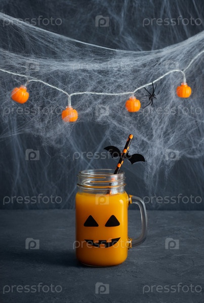 Сок из тыквы или моркови на Хэллоуин с лицом Джека-фонаря и соломинками для питья с летучей мышью. Забавные украшения для детской вечеринки. Вертикальная ориентация