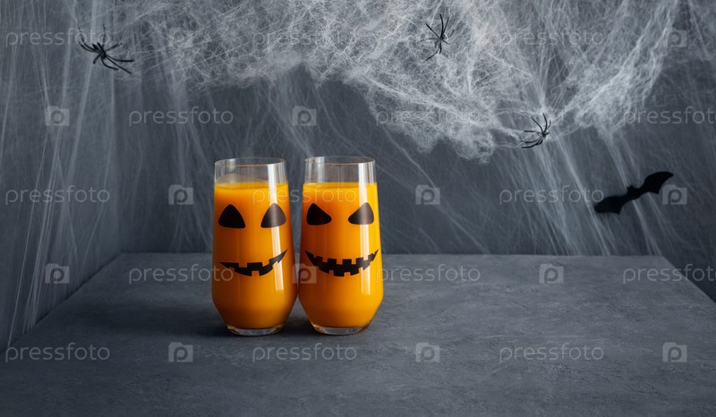 Хэллоуинский напиток на синем фоне. Тыквенный или морковный сок в стаканах с лицом Джека-фонаря. Копировать пространство. Баннер