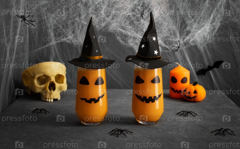 Хэллоуинские напитки в стаканах с ведьминскими шляпами на сером фоне. Украшения для сервировки стола на Хэллоуин с паутиной, черепом, свечами и пауками