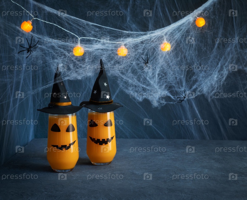 Два бокала хеллоуинского напитка с жуткими улыбками в черных шляпах ведьм на темно-синем фоне. Хэллоуинский тыквенный коктейль в паутине. Копировать пространство
