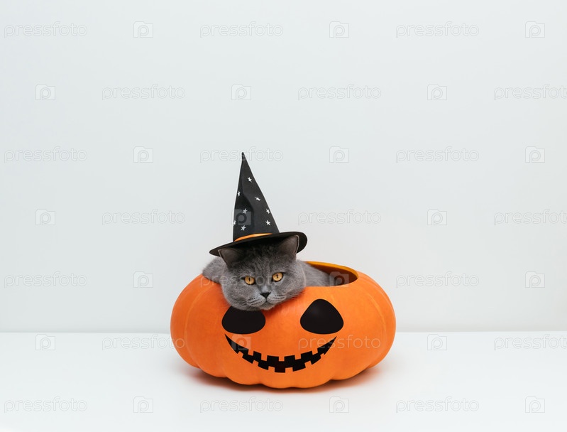 Кошка на Хэллоуин в шляпе ведьмы со звездами на белом фоне. Британский кот лежит в большой тыкве. Копировать пространство. Смешные питомцы на Хэллоуин