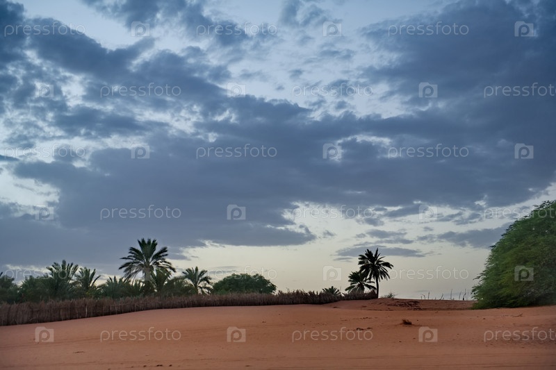 Западная Африка. Мавритания. Одинокие деревья акации со скудной листвой на каменистых холмах в горячих песках юго-западной окраины пустыни Сахара