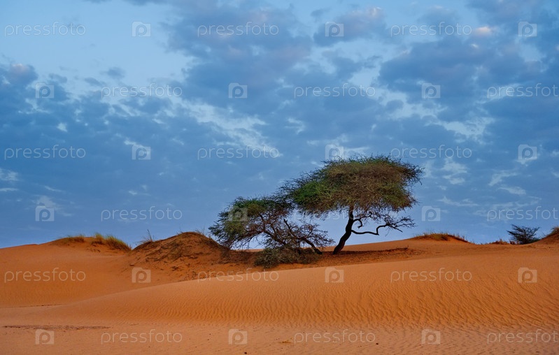 Западная Африка. Мавритания. Одинокие деревья акации со скудной листвой на каменистых холмах в горячих песках юго-западной окраины пустыни Сахара