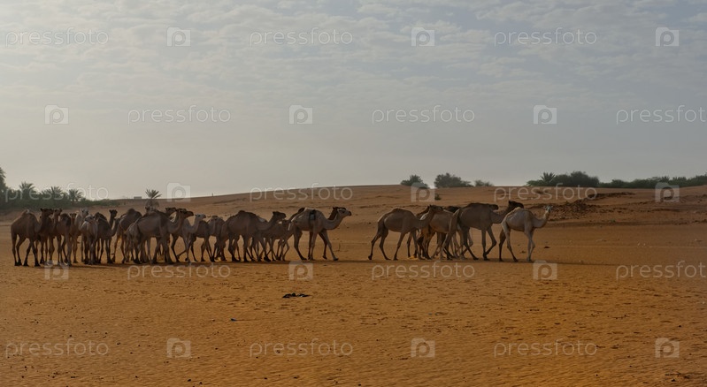 Западная Африка. Мавритания. Стадо одногорбых верблюдов в контровом рассветном свете передвигается по пескам пустыни Сахара в поисках еды и воды