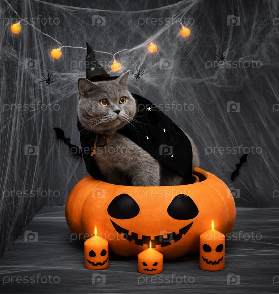 Хэллоуинский кот в черной шляпе ведьмы и мантии сидит в большой тыкве. Британский кот в костюме волшебника на темном фоне с горящими свечами