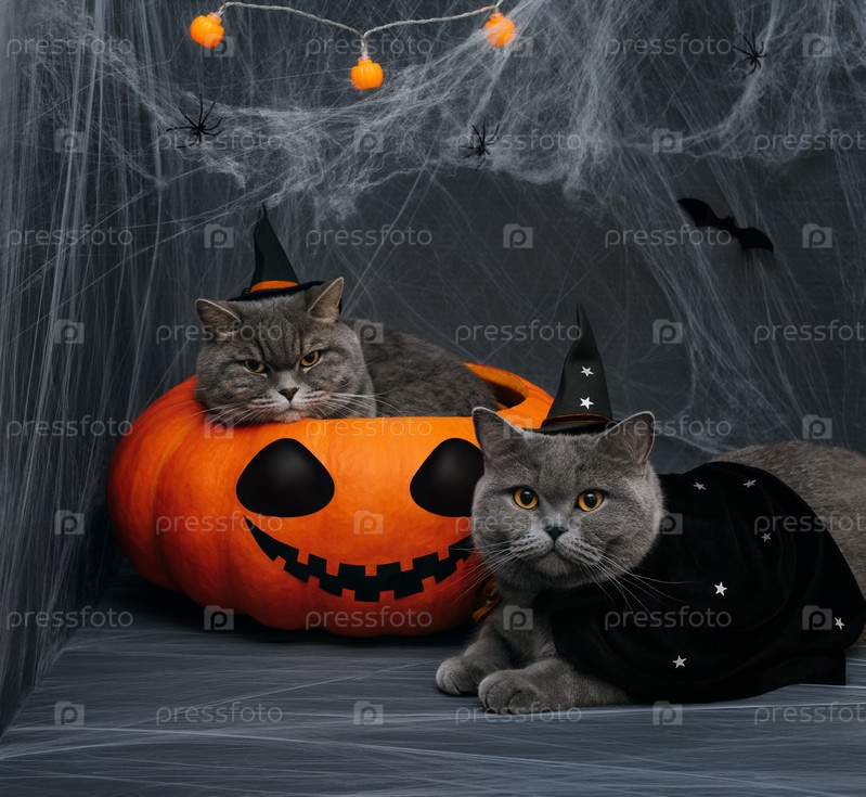 Плакат на Хэллоуин с котами в костюмах. Два кота в шляпах ведьм на темном фоне с головой Джека-тыквы. Смешной кот в костюме на Хэллоуин