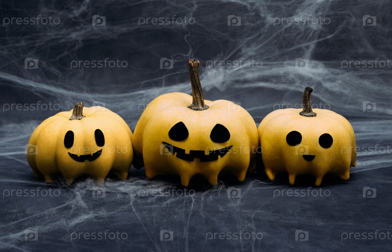 Тыквы на Хэллоуин на темно-синем фоне с паутиной крупным планом. Голова тыквы Джека-фонаря в форме привидения