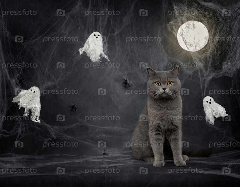 Британский кот на ночном фоне с украшениями на Хэллоуин. Кошка на Хэллоуин, призраки, паутина и светящаяся луна на темно-сером фоне с местом для копирования