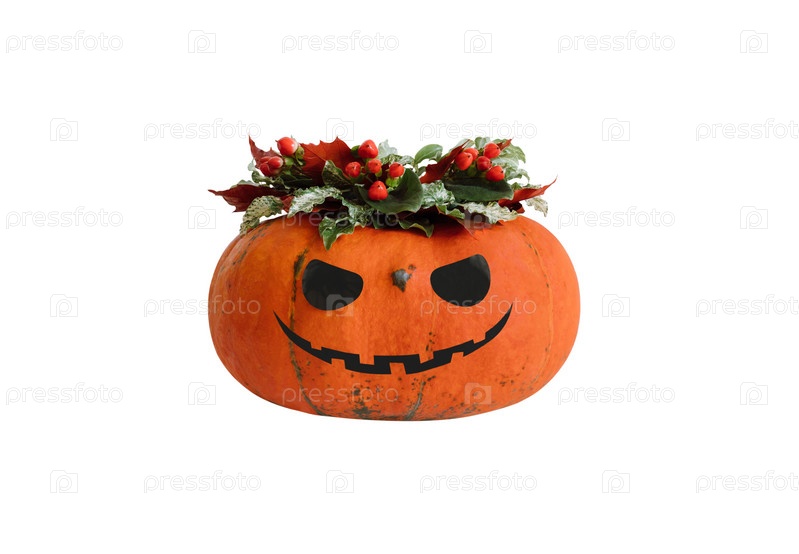 Тыквенная голова Джека-фонаря с цветами, изолированная на белом фоне. Тыква на Хэллоуин с букетом цветов