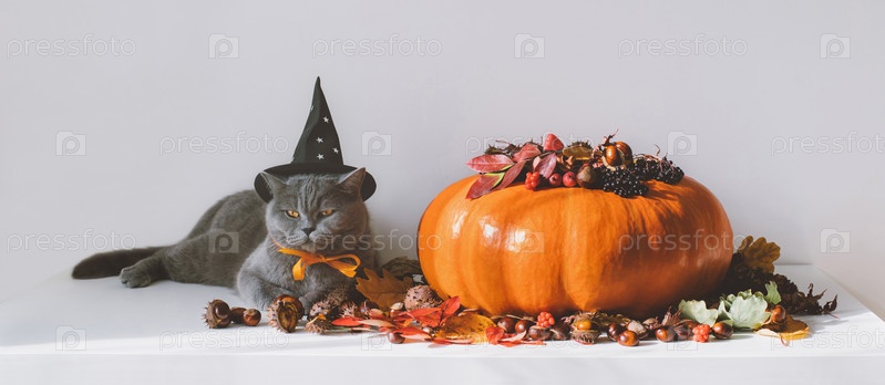Хэллоуинский забавный кот в шляпе ведьмы и большой тыкве с осенними украшениями на белом фоне. Баннер
