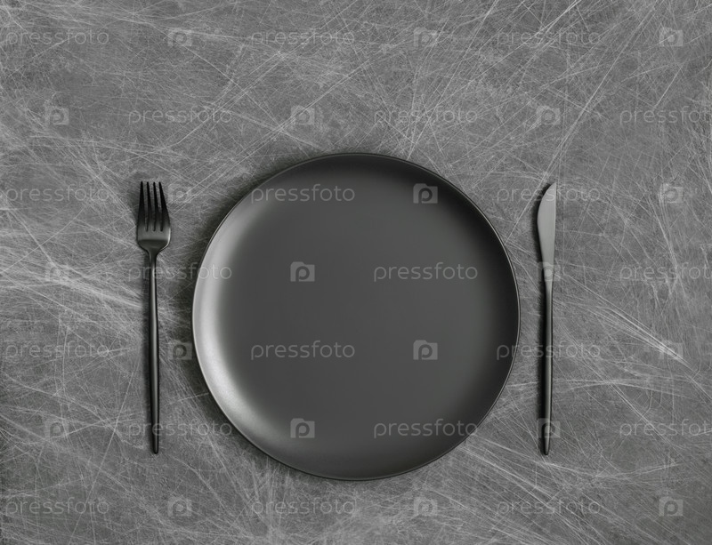 Сервировка стола на Хэллоуин с пустой черной тарелкой на темно-сером фоне с паутиной. Макет или шаблон. Вид сверху, плоская планировка