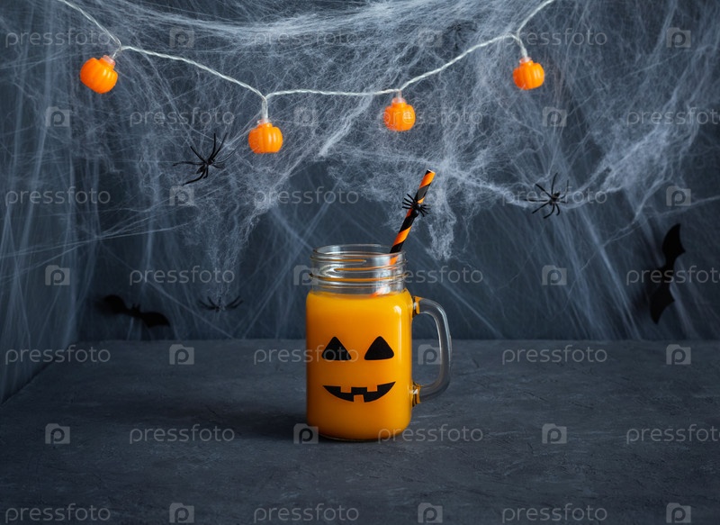Напиток на Хэллоуин в стеклянной банке на темно-синем фоне с пространством для копирования. Тыквенный или морковный сок в забавном праздничном оформлении