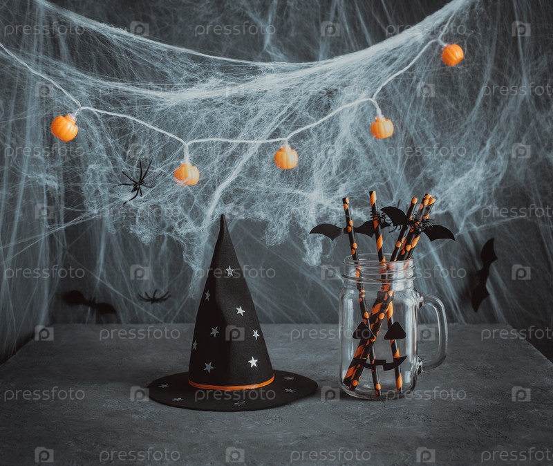 Сервировка стола для напитков на Хэллоуин со стеклянной банкой, трубочками для коктейлей, шляпой ведьмы и паутиной на темно-сером фоне