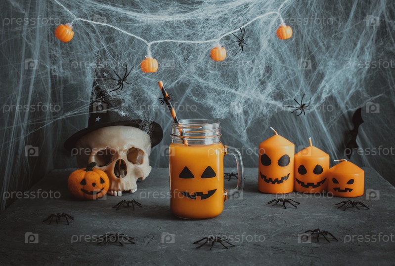 Сцена Хэллоуина с жутким напитком, тыквами, пауками и жуткой паутиной, висящей вокруг. Тыквенный сок с лицом Джека-фонаря на синем фоне