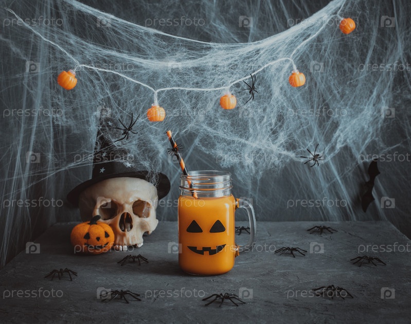 Сок на Хэллоуин в стеклянной банке со страшной улыбкой, черепом, паутиной и пауками на синем фоне. Украшения для вечеринки на Хэллоуин