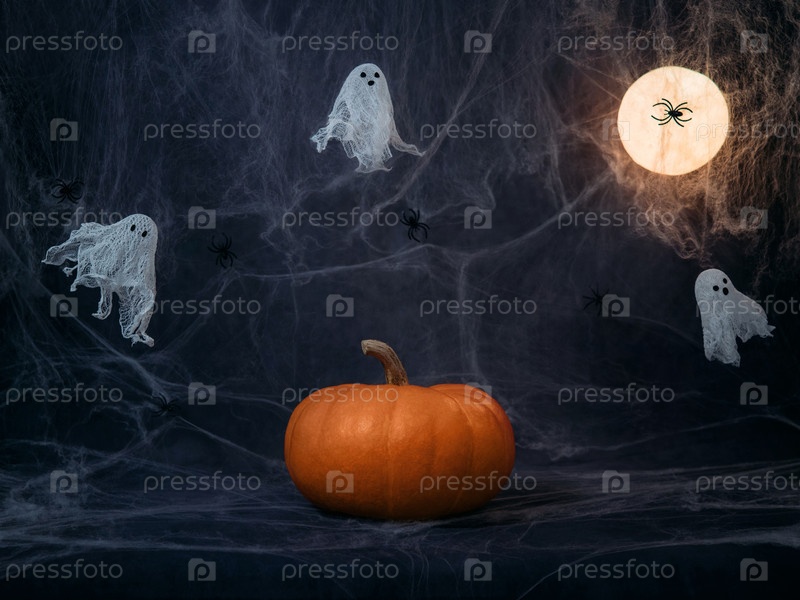 Фон на ночь Хэллоуина с тыквой, привидениями, паутиной и светящейся луной. Творческий декор на Хэллоуин своими руками. Поздравительная открытка на Хэллоуин