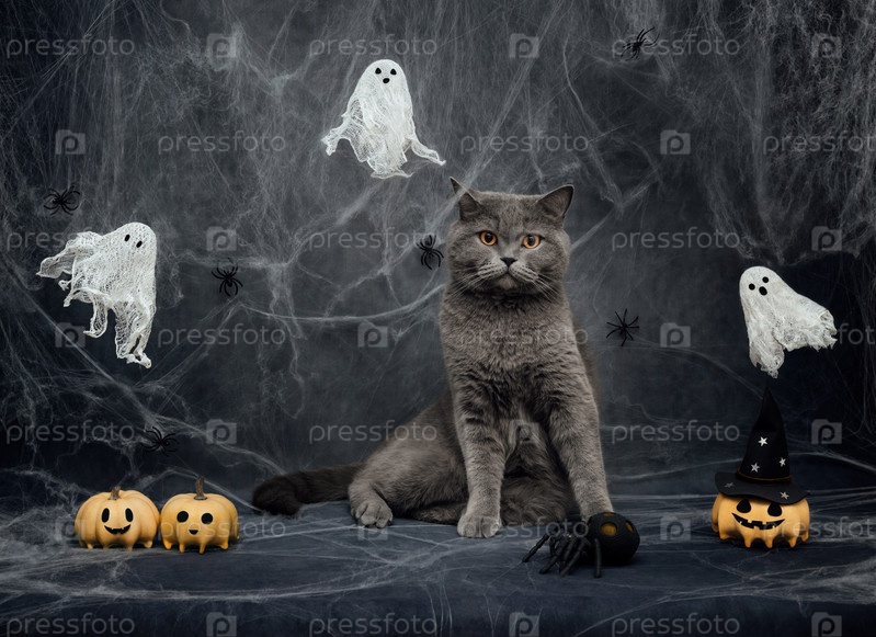Кошка на Хэллоуин на темно-сером фоне с паутиной, привидениями, тыквами-фонарями и пауками. Британская кошка с праздничными украшениями на Хэллоуин