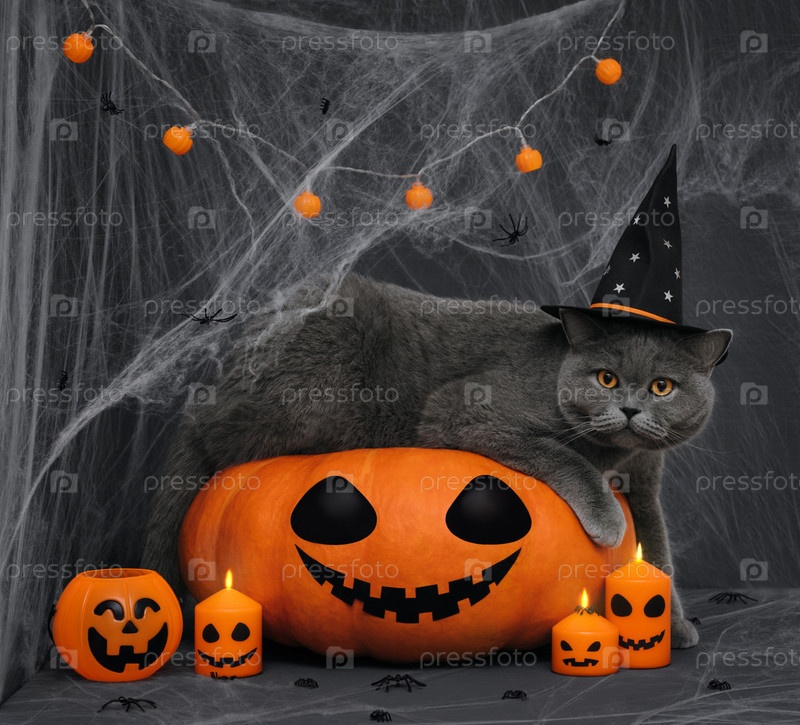 Кошка на Хэллоуин в черной шляпе ведьмы, лежащая в большой тыкве Джека Фонаря. Британский кот в тыкве на темном фоне. Украшения на Хэллоуин