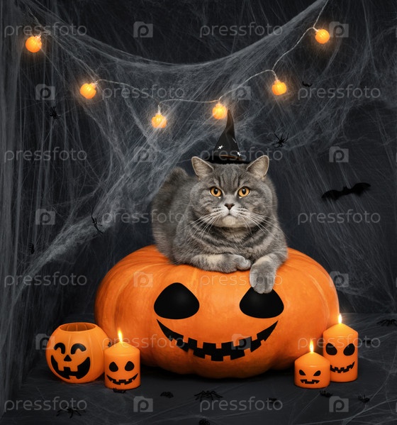 Кошка на Хэллоуин. Кот в шляпе ведьмы лежит на тыкве на Хэллоуин, свечах и паутине на темном фоне. Питомец в костюме волшебника. Смешной кот в костюме на Хэллоуин
