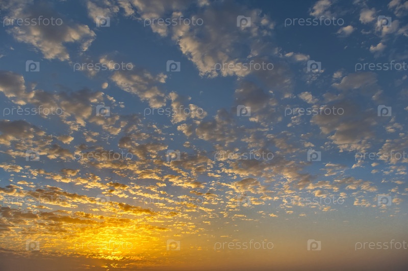 Россия, юг Западной Сибири. Панорамный вид вечернего неба с заходящим солнцем и разноцветными облаками