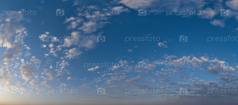 Россия, юг Западной Сибири. Панорамный вид вечернего неба с заходящим солнцем и разноцветными облаками