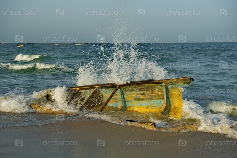 Западная Африка. Мавритания. Брызги морской воды от ударов прибрежных волн о борта останков разбитой рыбацкой лодки, выброшенной на берег Атлантическим океаном недалеко от города Нуакшот