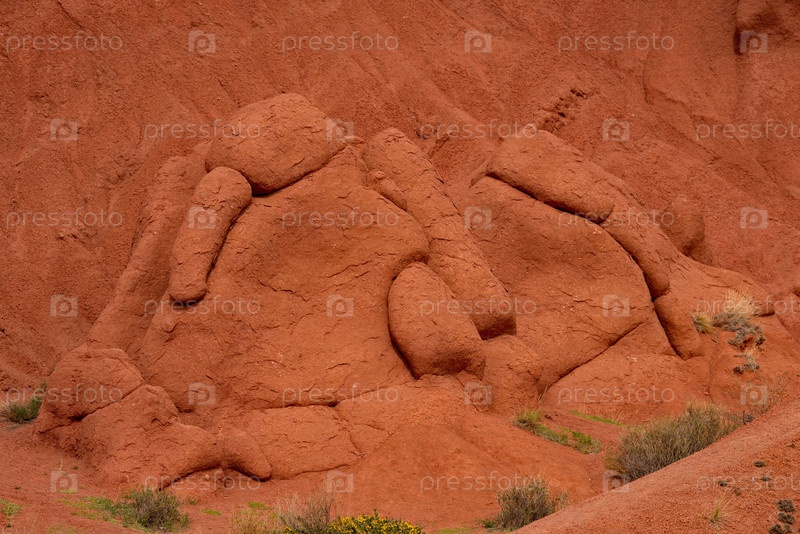 Северный Кыргызстан. Необычная текстура красно-желтых глинистых пород в знаменитом каньоне Сказка на побережье озера Иссык-Куль