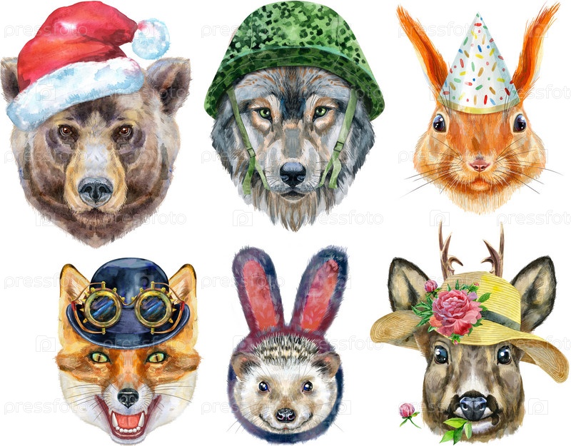 Акварельный рисунок животных - медведь, волк, лиса, косуля, еж и рыжая белка