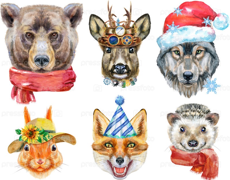 Акварельный рисунок животных - медведь, волк, лиса, косуля, еж и рыжая белка
