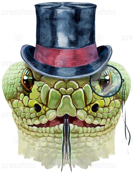 Голова змеи в цилиндре и с моноклем, изолированная на белом фоне. Зеленая рептилия акварельная иллюстрация