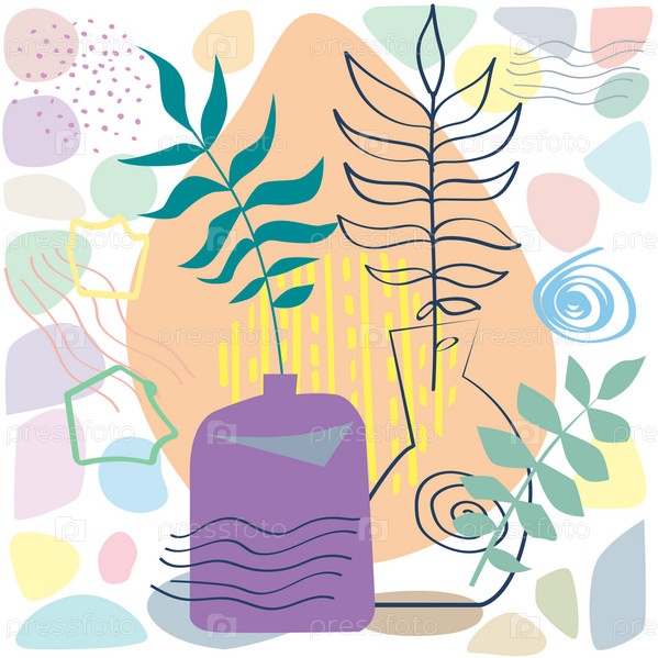 Бесшовная абстракция с вазами. Модный коллаж натюрморта с горшком, растением и вазой. Нарисованный вручную минималистский набор векторных форм. Иллюстрация горшка с изображением цветка для декоративных интерьеров
