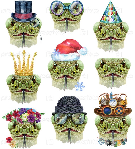 Набор портретов змей с различными аксессуарами. Акварельная иллюстрация на белом фоне