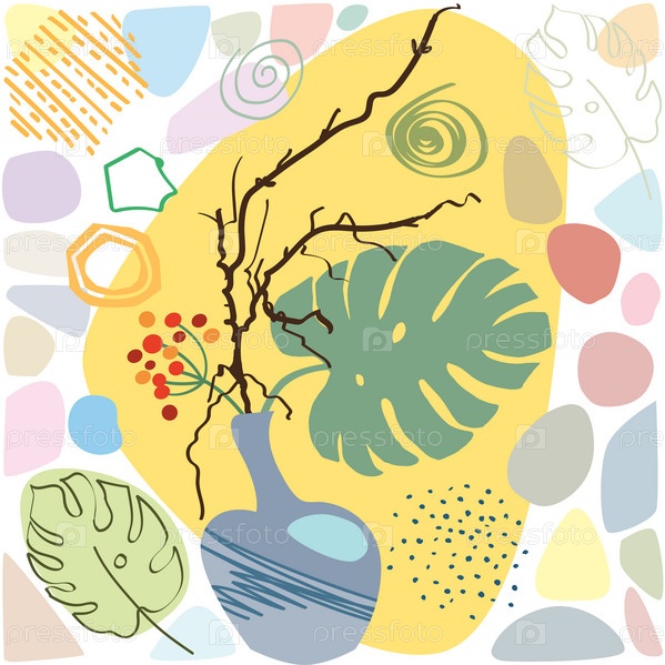 Бесшовная абстракция с вазами. Модный коллаж натюрморта с горшком, растением и вазой. Нарисованный вручную минималистский набор векторных форм. Иллюстрация горшка с изображением цветка для декоративных интерьеров